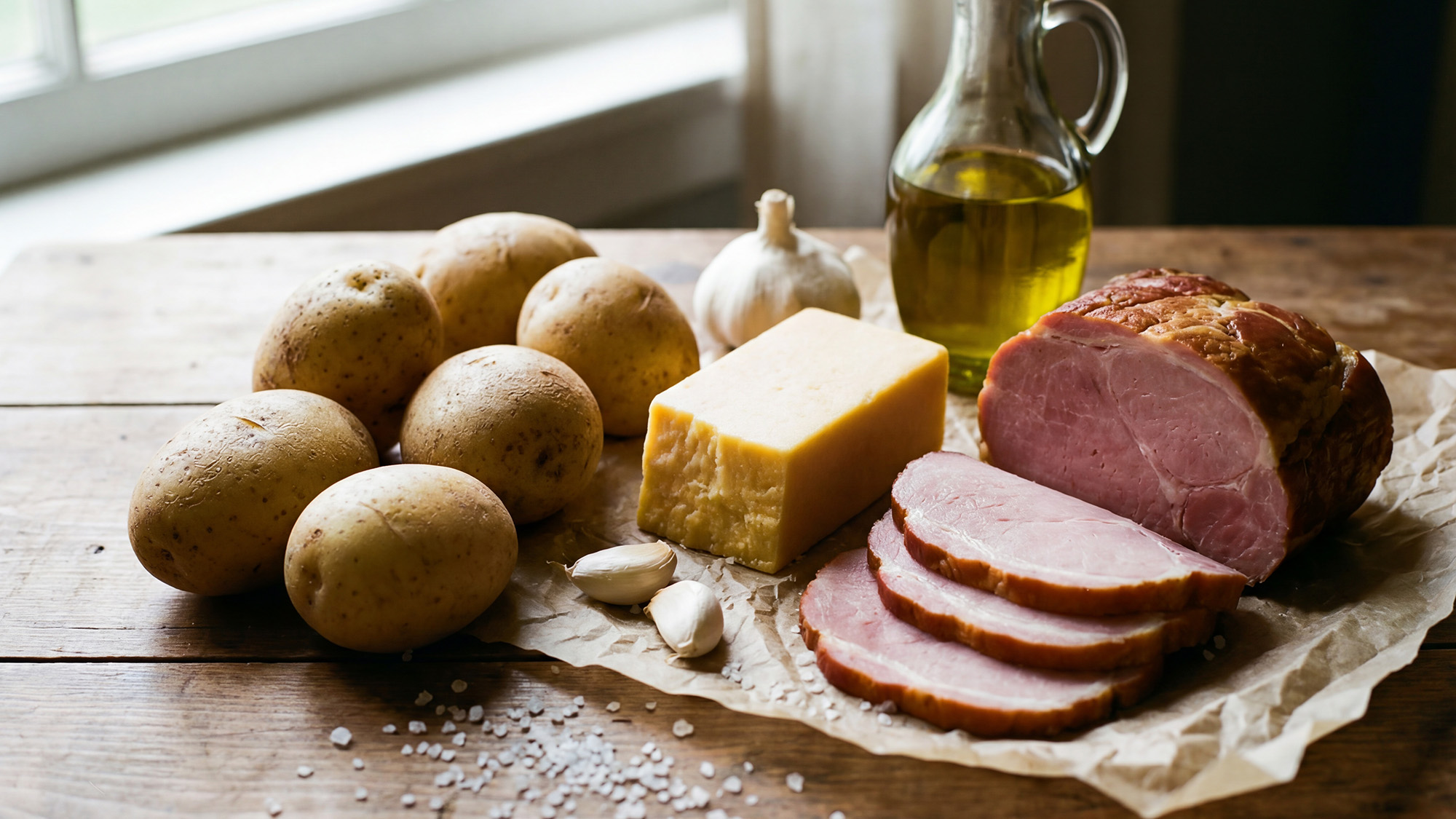 Brambory, kvalitní šunka, strouhaný sýt, česnek, sůl, olivový olej