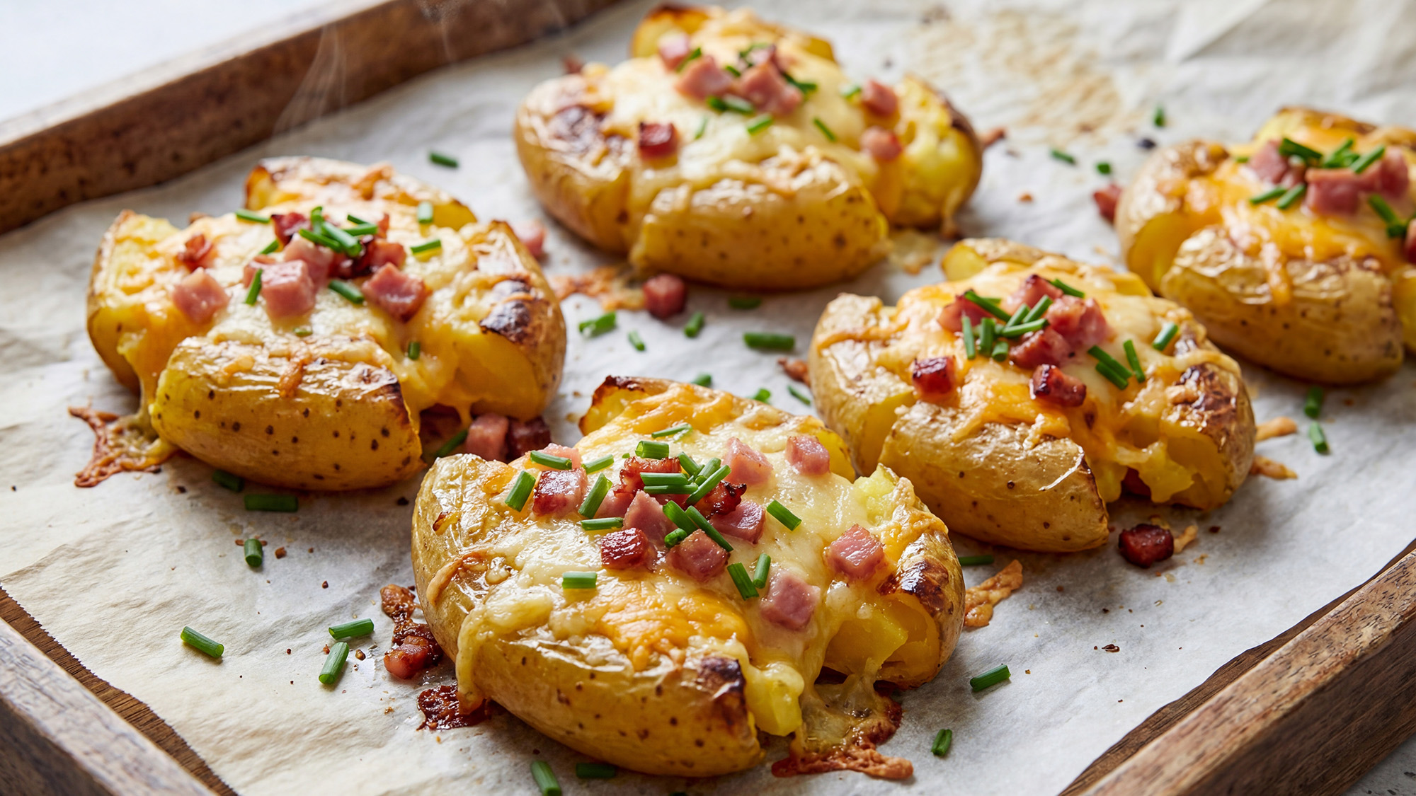 Uvaříme brambory ve slupce, klidně můžou být i den předem uvařené. Na plech dáme pečící papír a troubu rozehřejeme na 180 stupňů. Plech potřete lehce olivovým olejem, položte na něj brambory a rozmáčkněte třeba skleničkou. Doprostřed brambory vložte šunku a posypte sýrem, podle chuti česnekem (klidně sušený jako koření), osolte a dejte zapéct. Až bude sýr dozlatova, je hotovo. Pokud byste dělali třeba jen tři brambory, je možné je udělat opět v horkovzdušné fritéze na 185 stupňů cca 10 – 15 minut.