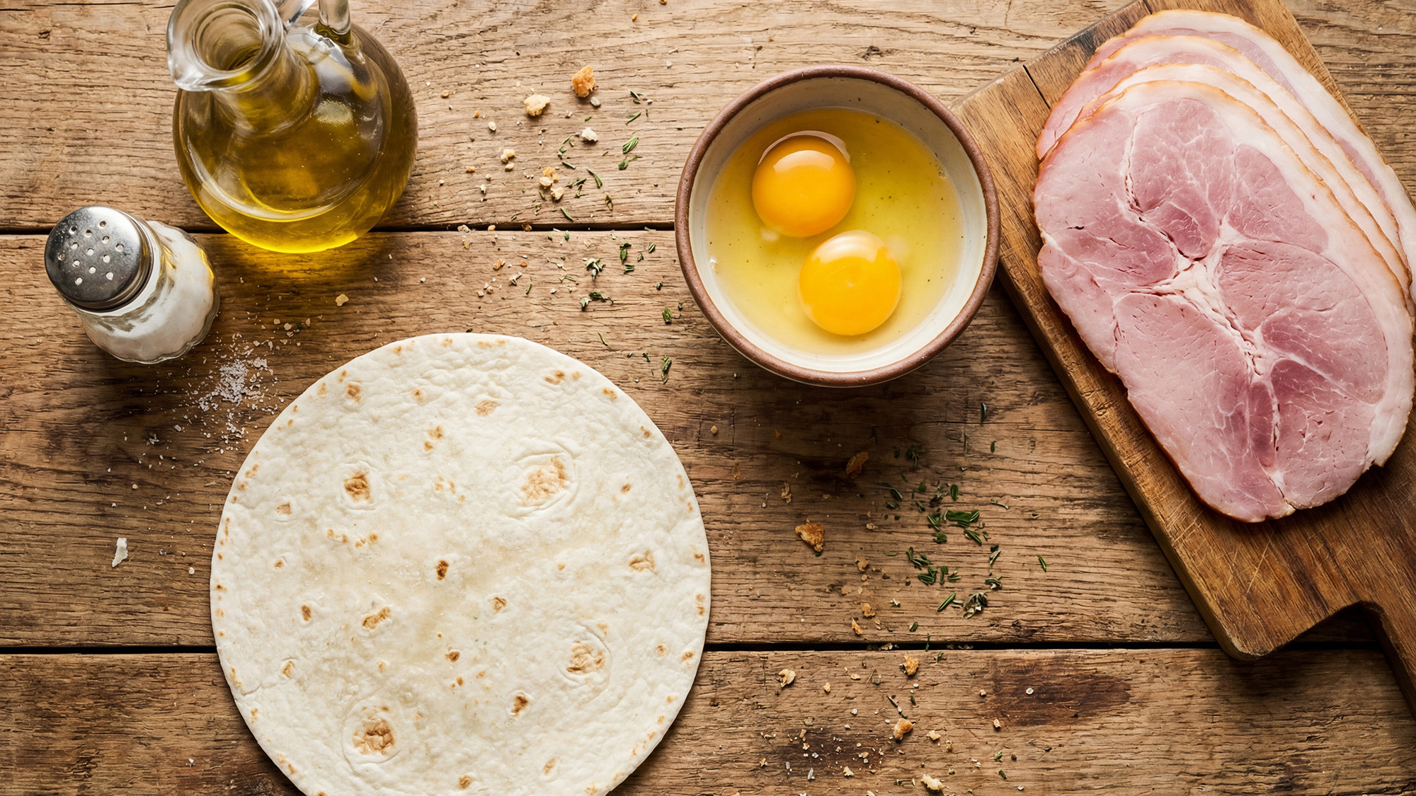 pšeničná tortilla (může být i jiná dle chuti), šunka s vysokým podílem masa, 2 vejce, lžička olivového oleje (nebo olej ve spreji, pak je možné dát i míň)